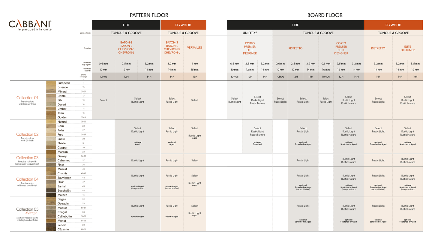 1. El suelo suelos de lamas, suelos con patrón 2. El color Elija entre 35 colores en 5 colecciones 3. El estilo Elección de 3 estilos y 2 operaciones opcionales 4. La medida 9 medidas de lama para elegir 5. El soporte 2 soportes para elegir: HDF o Contrachapado de Abedul ❭ Visión general