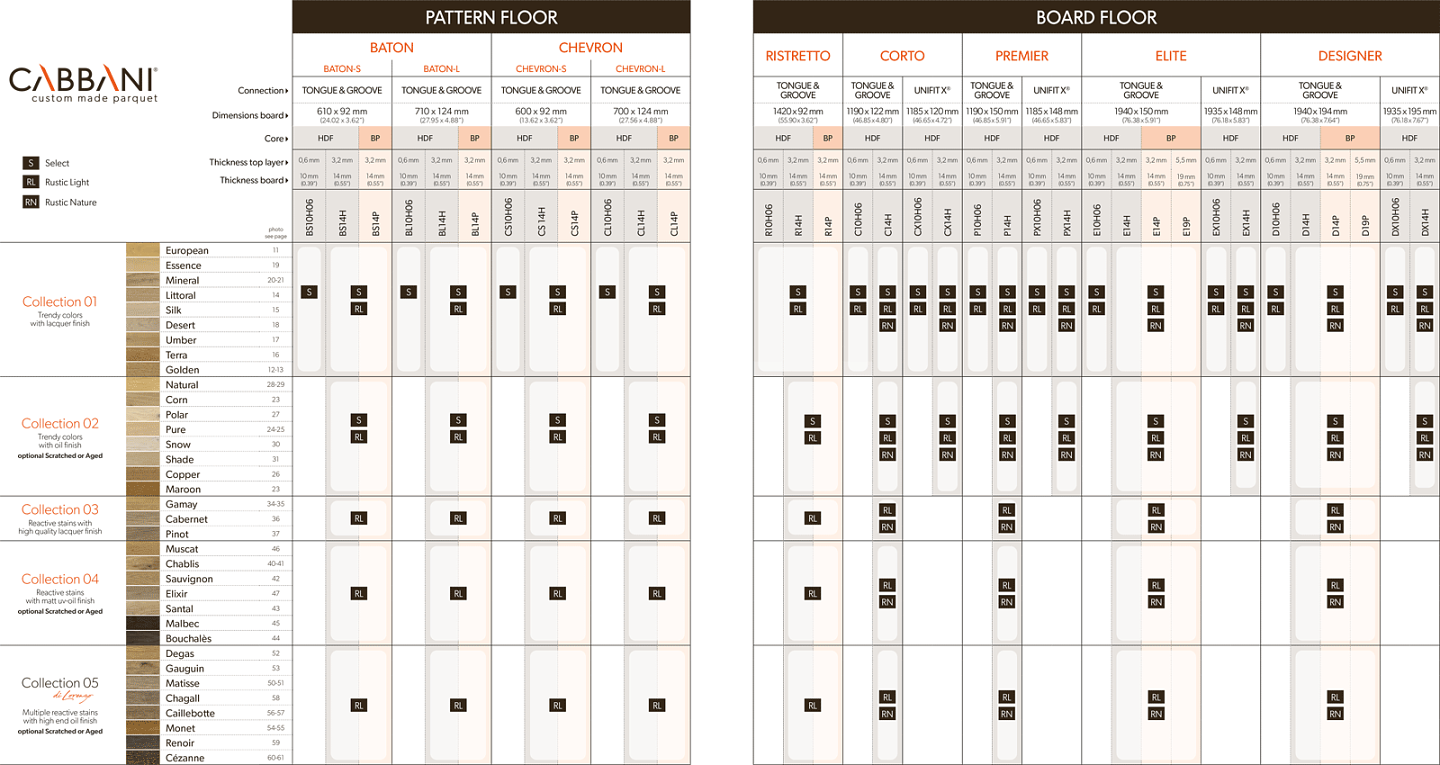 1. El suelo suelos de lamas, suelos con patrón 2. El color Elija entre 35 colores en 5 colecciones 3. El estilo Elección de 3 estilos y 2 operaciones opcionales 4. La medida 9 medidas de lama para elegir 5. El soporte 2 soportes para elegir: HDF o Contrachapado de Abedul ❭ Visión general
