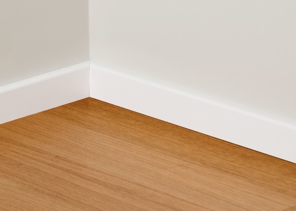 Plinthes pré-peintes blanches avec bord supérieur arrondi d’une hauteur de 69 mm.