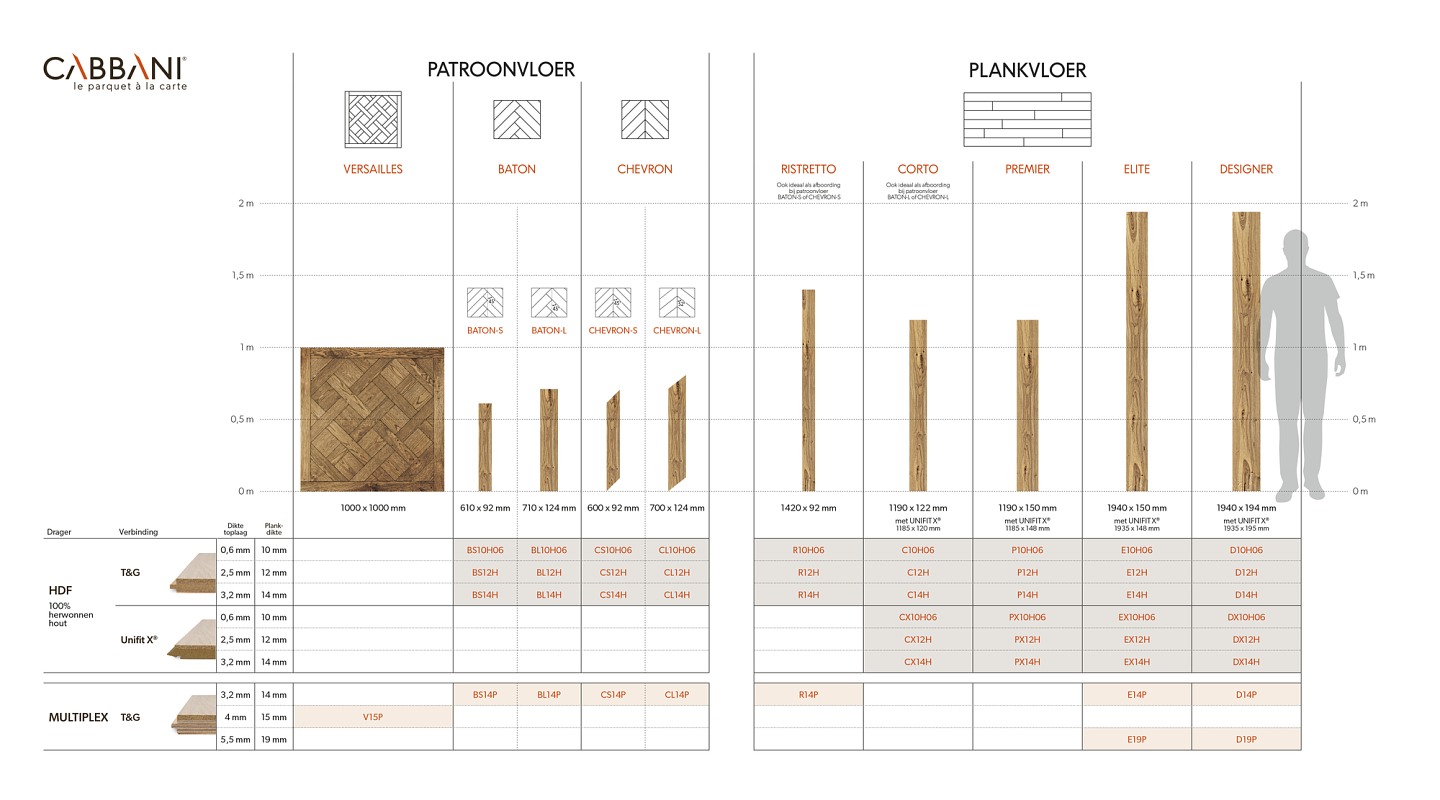 Cabbani is beschikbaar in 9 plankformaten. Kort, smal, lang, breed… Laat uw keuze bepalen door de vorm en grootte van de ruimte. Voor grotere oppervlakken kiest u best voor DESIGNER, een lange, brede plank. Voor kleinere ruimtes raden we een smallere plank aan zoals PREMIER of ELITE. Deze doen de kamer automatisch groter lijken.