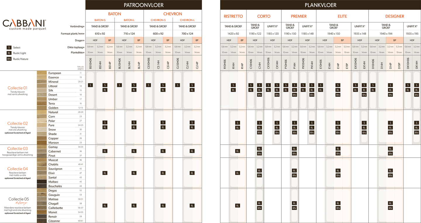 - Productopbouw (totale dikte/toplaag): 10/0,6mm, 12/2,5mm, 14/3,2 mm en 19/5,5 mm (15/4 mm bij Versailles)